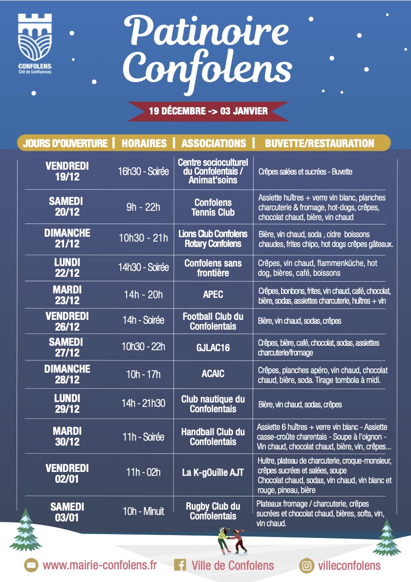 À l’occasion des fêtes de fin d’année, la Ville de Confolens vous donne rendez-vous sous les Halles pour une nouvelle édition de sa patinoire éphémère, un moment convivial et festif à partager en famille ou entre amis.